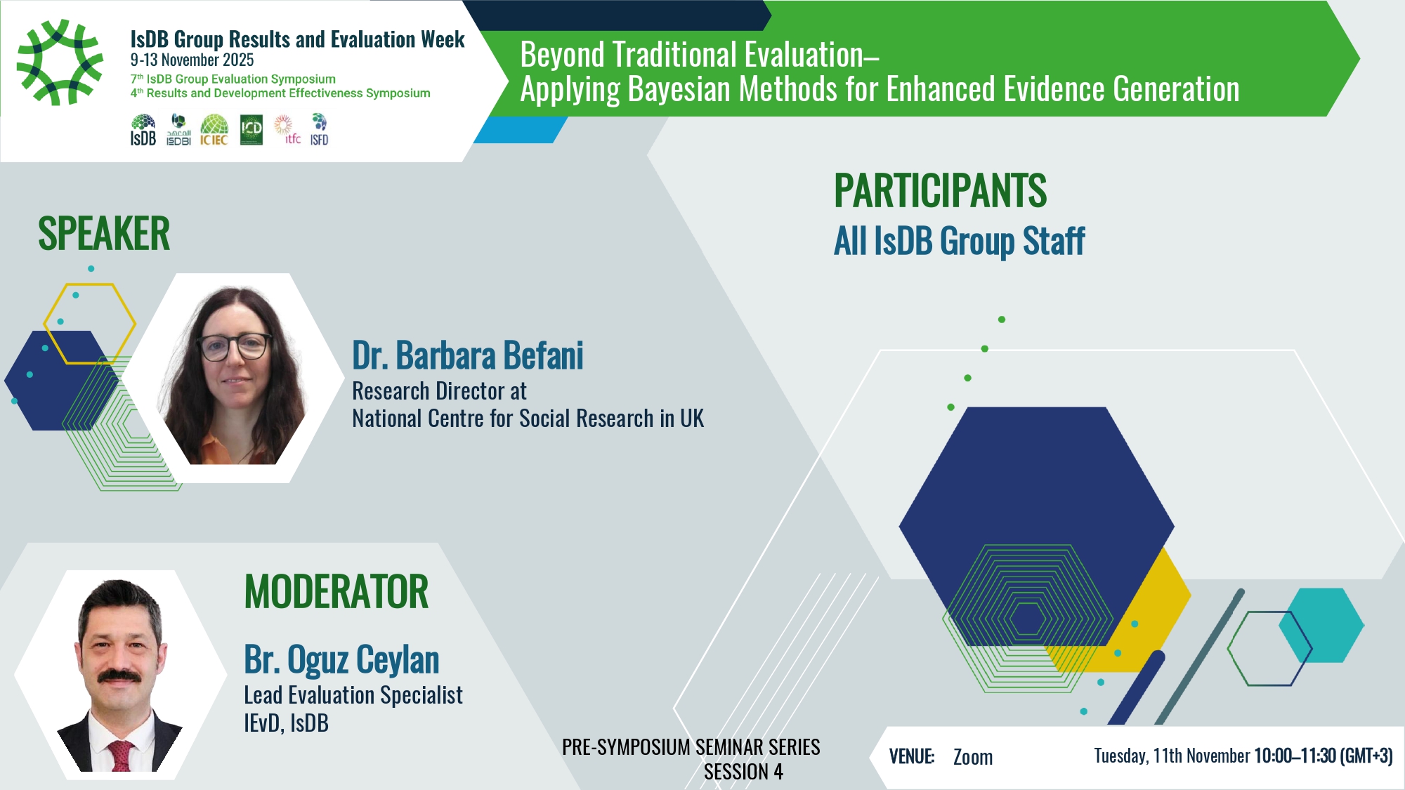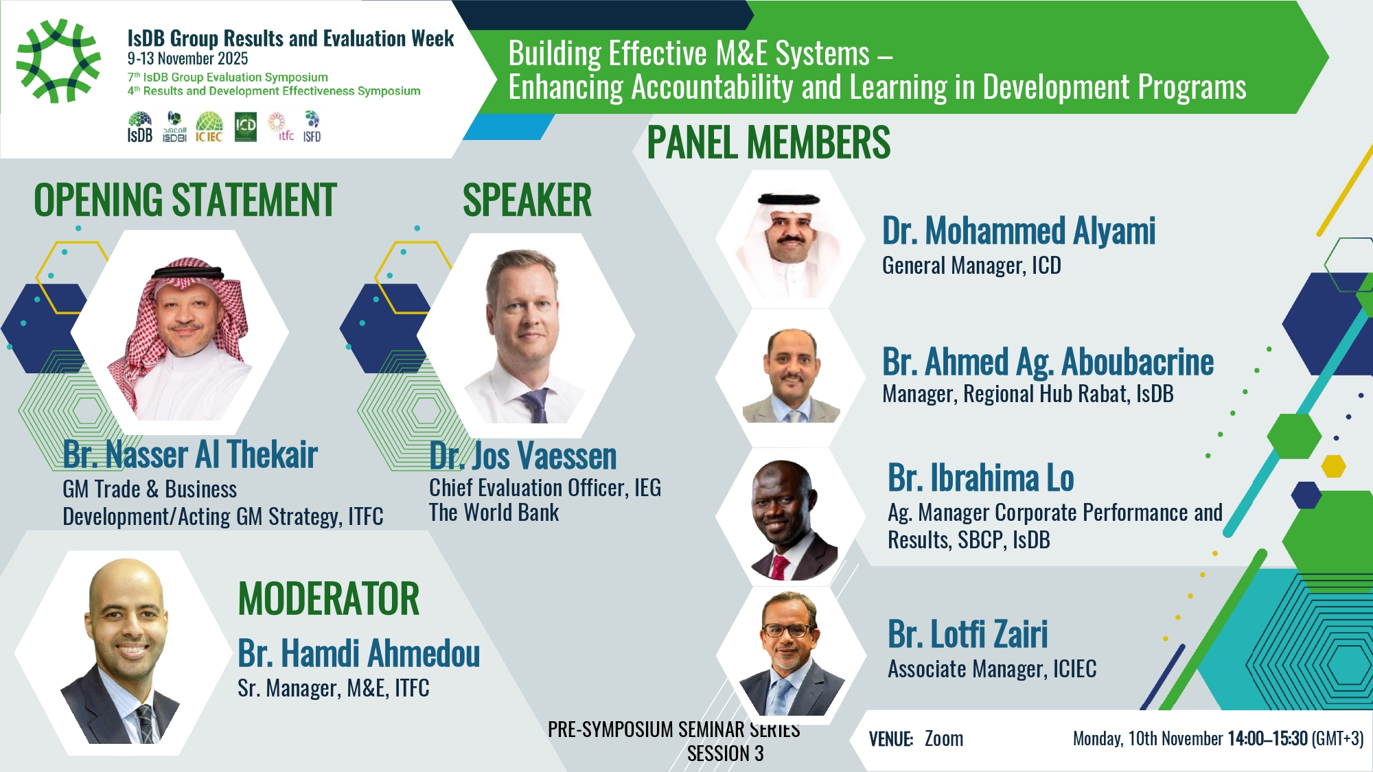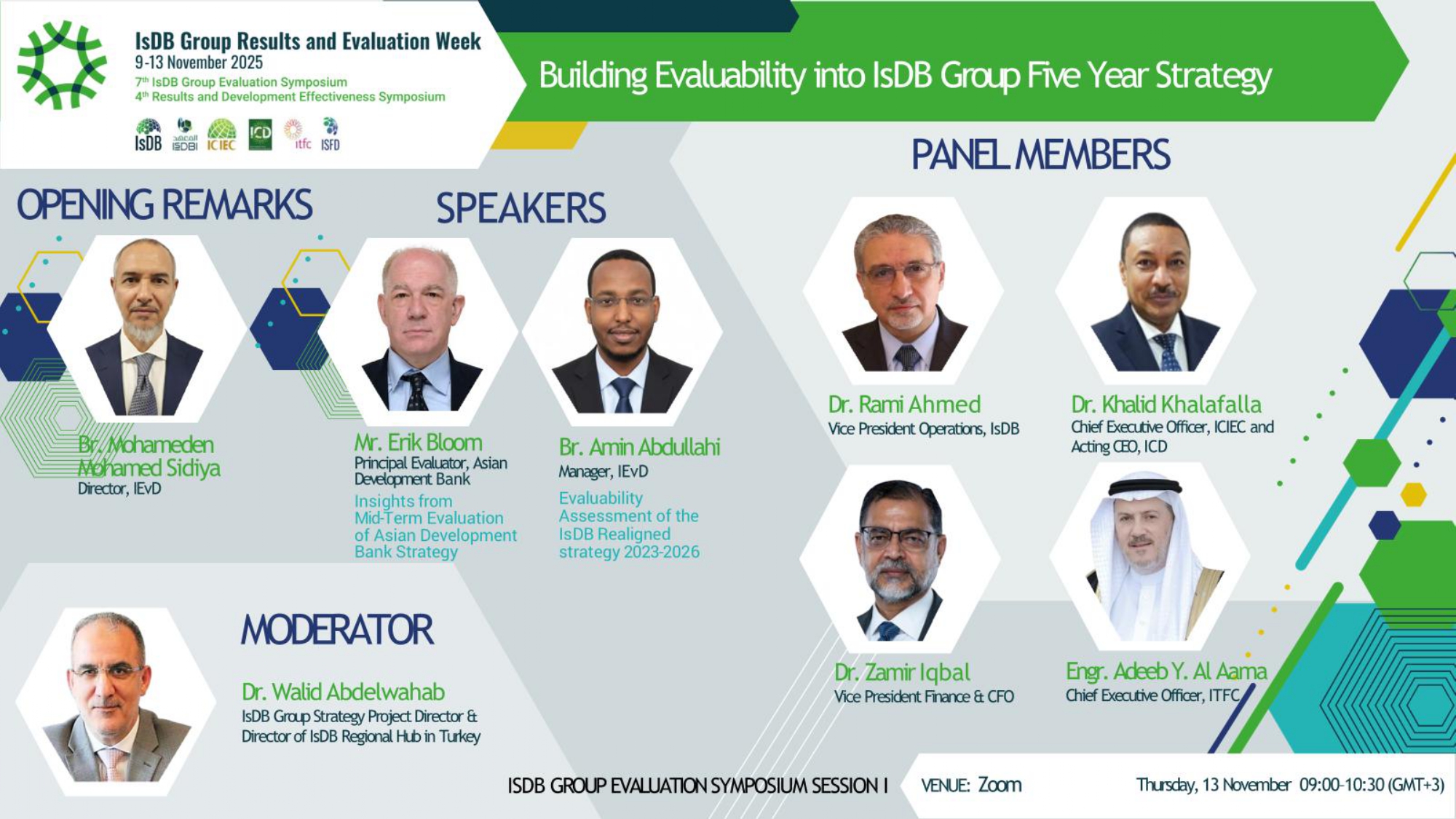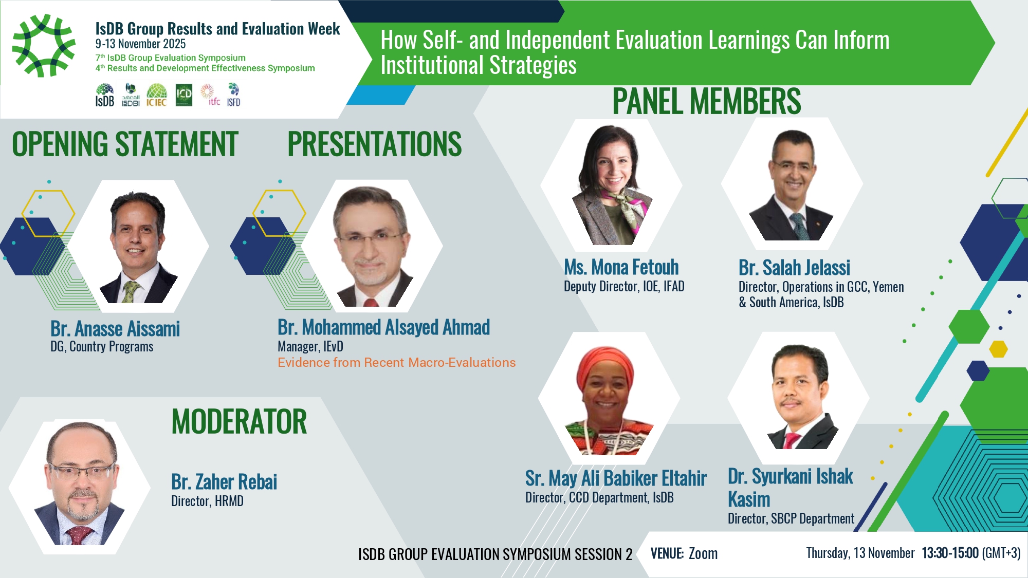 Saudi Arabia IsDB Group Results and Evaluation Week (9–13 November 2025) – Videos of the Sessions 18 November 2025 ➝ Watch recording of: Building Evaluability into IsDB Group Five Year Strategy new ➝ Watch recording of: Beyond Traditional Evaluation Applying Bayesian Methods for Enhanced Evidence Generation ➝ Watch recording of: How Self- and Independent Evaluation Learnings Can Inform Institutional Strategies ➝ Watch recording of: The Problem and Solution of Measuring Results in Global Development ➝ Watch recording of: Building Effective M&E Systems Enhancing Accountability and Learning in Development Programs